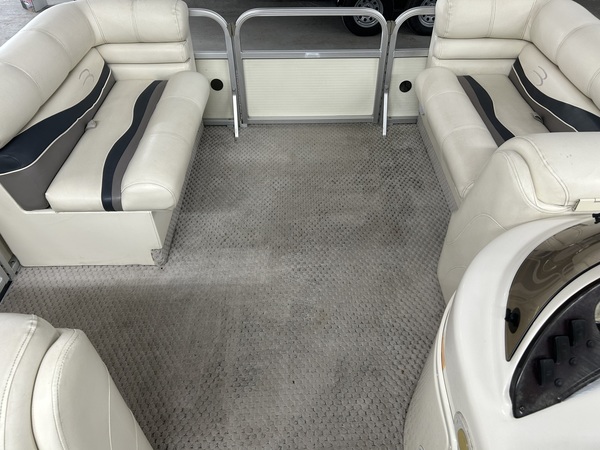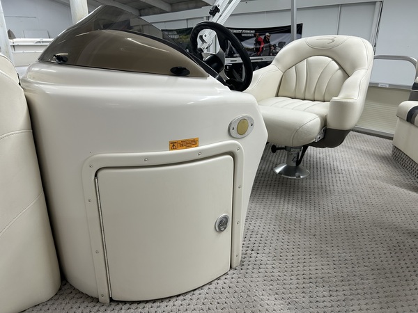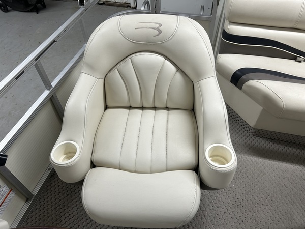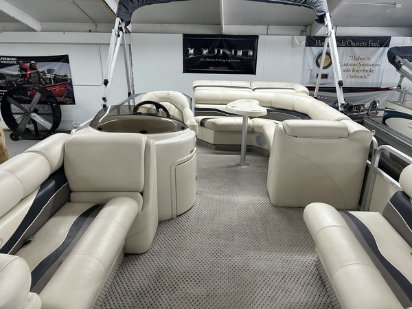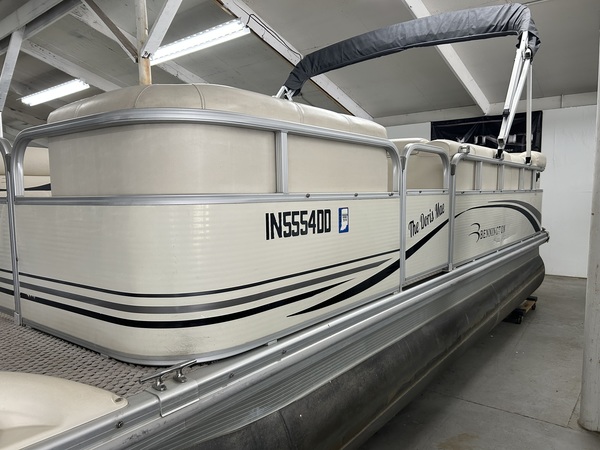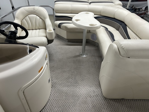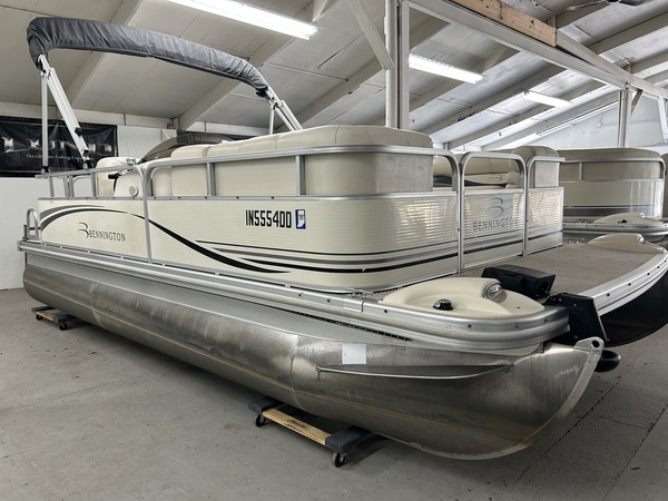 Nice Bnnington 1850GL with room for 9 people. The features and accessories on this boat include 2 - 23" pontoons, tan carpeted flooring, 26-gallon fuel tank, docking lights, ski tow rings, bimini top with boot, table with pedestal, 40" one-piece fiberglass console with wood grain dash insert, chrome ringed and fog resistant RPM, fuel, trim, volt, and digital depth gauges, super sport steering wheel, Alpine stereo with CD Player and 4 speakers, rear fold-up boarding ladder, interior courtesy light, deluxe helm seat w/cupholders, bolster and swivel, composite seat bases, 3 entry doors, low profile windscreen, stainless steel 6" cleats, horn, fire extinguisher, Minn Kota Deck Hand 25 electric anchormate w/mushroom anchor, and after-market gray cover.